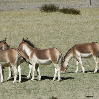Zeitvergessen stehen Kiangs, tibetische Wildesel, in der Fläche.